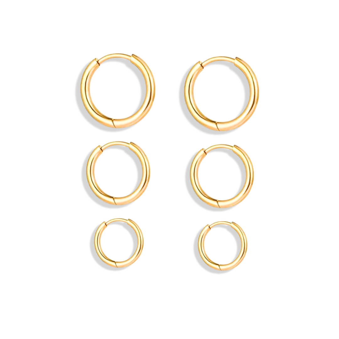 Notre jeu de boucles d'oreilles créoles triples comprend trois paires de créoles de différentes tailles, réalisant vos rêves d'empiler les créoles. Portez-les tout le temps, que ce soit dans la salle de bain, à la gym ou dans la mer, et elles ne perdront jamais leur couleur.