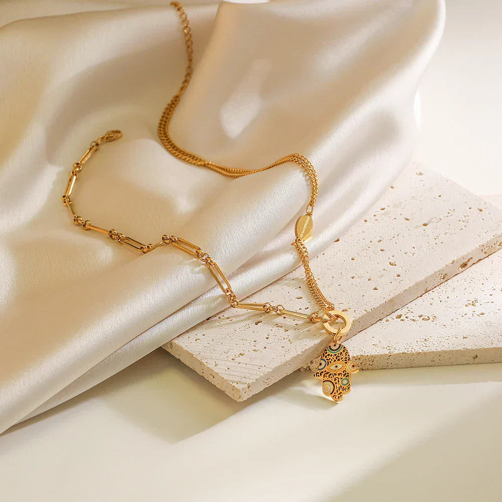 Découvrez la protection et l'élégance avec notre collier pendentif Main de Fatma. Cet accessoire offre non seulement une connexion unique avec la tradition et le symbolisme positif de la Main de Fatma, mais il possède également un design innovant et sophistiqué, élevant instantanément votre look avec une touche d'élégance.