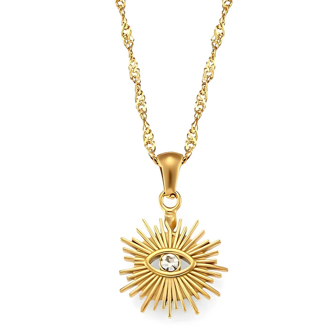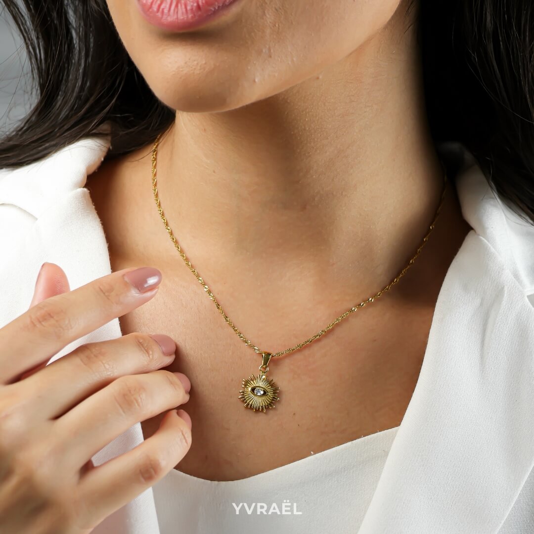 Le Collier Occhio est un puissant symbole de protection et de bonne énergie. Alliant le mysticisme de l'œil turc et la force radiante du soleil, il reflète la lumière et la positivité dans chaque détail. Au centre, une zirconite éclatante intensifie son éclat, apportant encore plus de magnétisme à celui qui le porte.