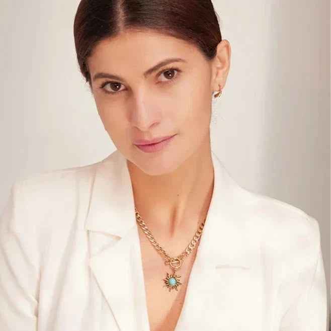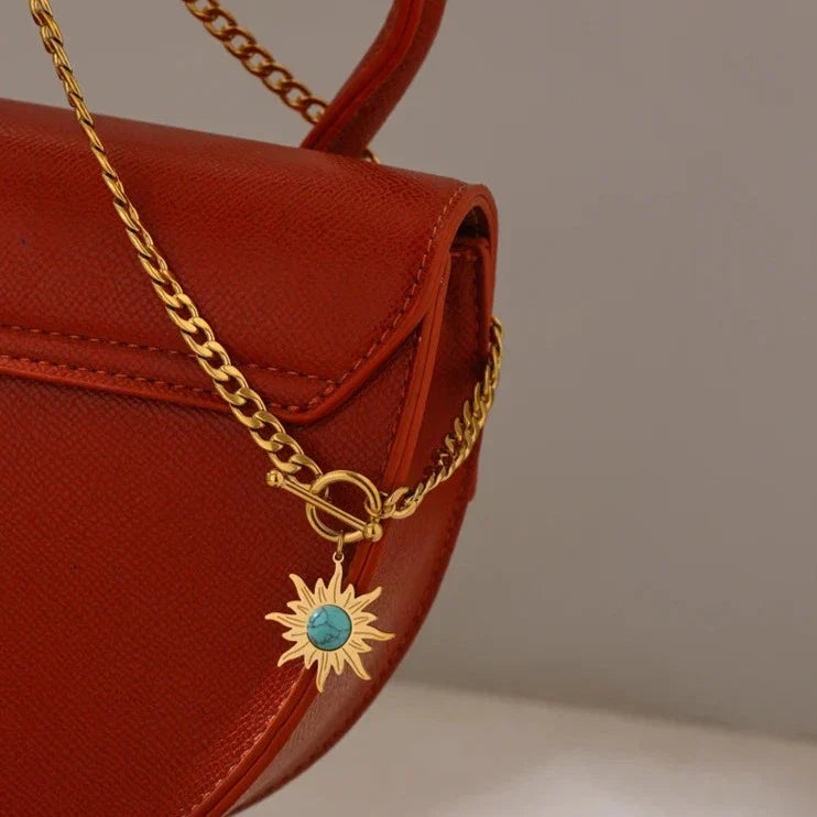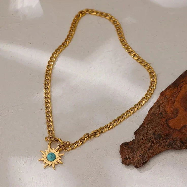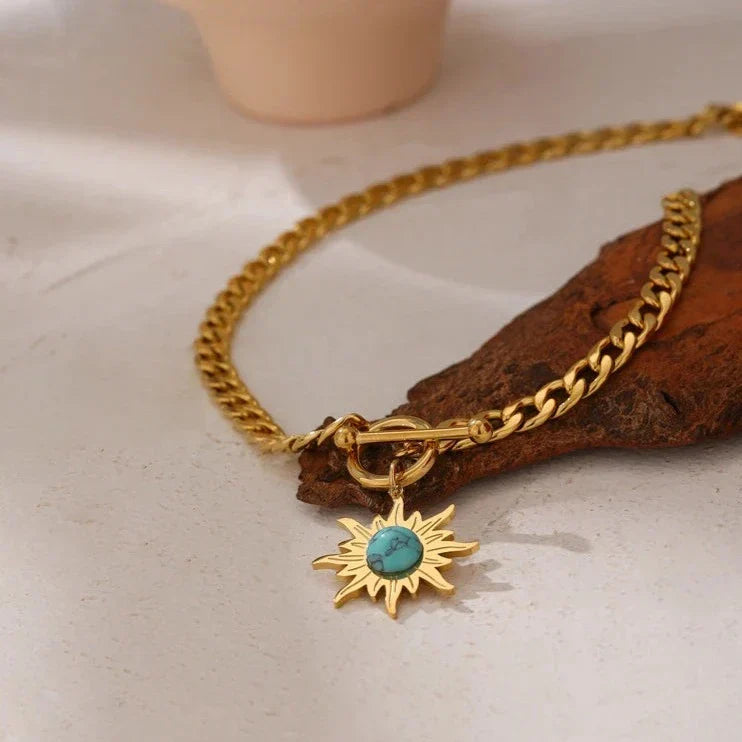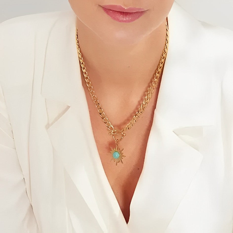 Le point focal est le pendentif en forme de soleil, orné d’une vibrante pierre turquoise, qui ajoute une touche de couleur et d’éclat à ton style.